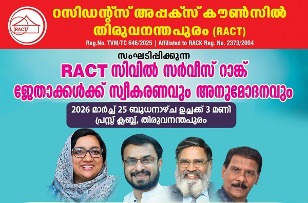 റസിഡൻസ് അപ്പക്സ് കൗൺസിൽ തിരുവനന്തപുരം ജില്ലയിലെ സിവിൽ സർവീസ് റാങ്ക് ജേതാക്കൾക്ക് സ്വീകരണം നൽകുന്നു.