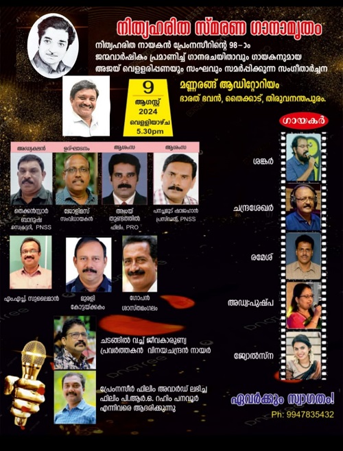 ഗാനരചയിതാവും ഗായകനുമായ അജയ് വെള്ളരിപ്പണയും സംഘവും സമർപ്പിക്കുന്ന സംഗീതാർച്ചന നിത്യ ഹരിത സ്മരണ ഗാനാമൃതം  ആഗസ്റ്റ് 9 വെള്ളിയാഴ്ച  വൈകിട്ട് 5.30 ന് തൈയ്ക്കാട് ഭാരത് ഭവൻ മണ്ണരങ്ങ് ആഡിറ്റോറിയത്തിൽ നടക്കും. ചലച്ചിത സംവിധായകൻ ജോളിമസ് ഉദ്ഘാടനം ചെയ്യും. പ്രേംനസീർ സുഹൃത് സമിതി സംസ്ഥാന സെക്രട്ടറി തെക്കൻസ്റ്റാർ ബാദുഷ അധ്യക്ഷനായിരിക്കും.പ്രസിഡന്റ്‌ പനച്ചമൂട് ഷാജഹാൻ, ഫിലിം പിആർഒ  അജയ് തുണ്ടത്തിൽ,