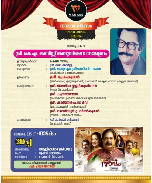 തിരുവനന്തപുരം : ചലച്ചിത്ര, നാടക നടൻ കെ. എ അസീസ്സ് അനുസ്മരണ സമ്മേളനം ഒക്ടോബർ 17 വ്യാഴാഴ്‌ച വൈകിട്ട് 5.45 ന് തിരുവനന്തപുരം പ്രിയദർശിനി ഹാളിൽ നടക്കും. മനസ്സ് (മലയാള നാടക സഹൃദയ സംഘം)  സംഘടിപ്പിക്കുന്ന ചടങ്ങ് കേരള സംസ്ഥാന ചലച്ചിത്ര അക്കാഡമി ചെയർമാൻ പ്രേംകുമാർ ഉദ്ഘാടനം ചെയ്യും. കവിയും സംവിധായകനുമായ കാര്യവട്ടം ശ്രീകണ്ഠൻ നായർ അധ്യക്ഷനായിരിക്കും.കാഥികൻ അയിലം ഉണ്ണികൃഷ്ണൻ, പ്രവാസി ഭാരതി വിഷ്വൽ റേഡിയോ ചെയർമാൻ ചന്ദ്രസേനൻ, കെ. എ അസീസ്സിന്റെ മകൻ രാജാ അസീസ്സ്, ഡോക്യുമെന്ററി സംവിധായകൻ കാഞ്ഞിരംപാറ രവി, ചലച്ചിത്ര, സീരിയൽ താരം വഞ്ചിയൂർ പ്രവീൺകുമാർ, മനസ്സ് സെക്രട്ടറി കല്ലിയൂർ രവിചന്ദ്രൻ തുടങ്ങിയവർ സംസാരിക്കും. 6.45 ന് ആറ്റിങ്ങൽ ശ്രീധന്യയുടെ നാടകം 'അപ്പ 'അരങ്ങേറും. രാജാ അസീസ്സ് ആണ് നാടകം സ്പോൺസർ ചെയ്യുന്നത്.