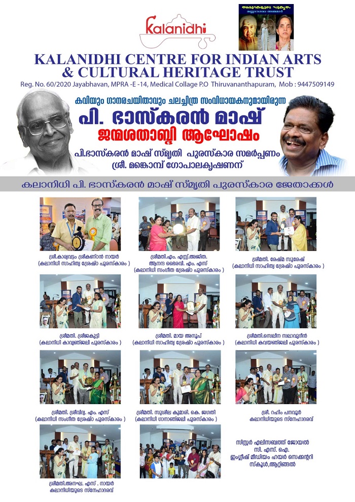 കലാനിധി ട്രസ്റ്റ്‌ ചെയർപേഴ്സൺ ഗീതാ രാജേന്ദ്രൻ അധ്യക്ഷയായിരുന്നു. ഗാനാലാപന മത്സര വിജയികൾക്കുള്ള സമ്മാനദാനം, കാവ്യശ്രേഷ്ഠ പുരസ്‌കാര വിതരണം,
