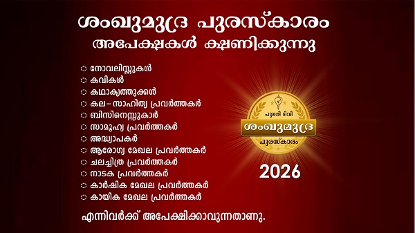 'ശംഖുമുദ്ര പുരസ്കാരം 2026' അപേക്ഷകൾ ക്ഷണിക്കുന്നു.